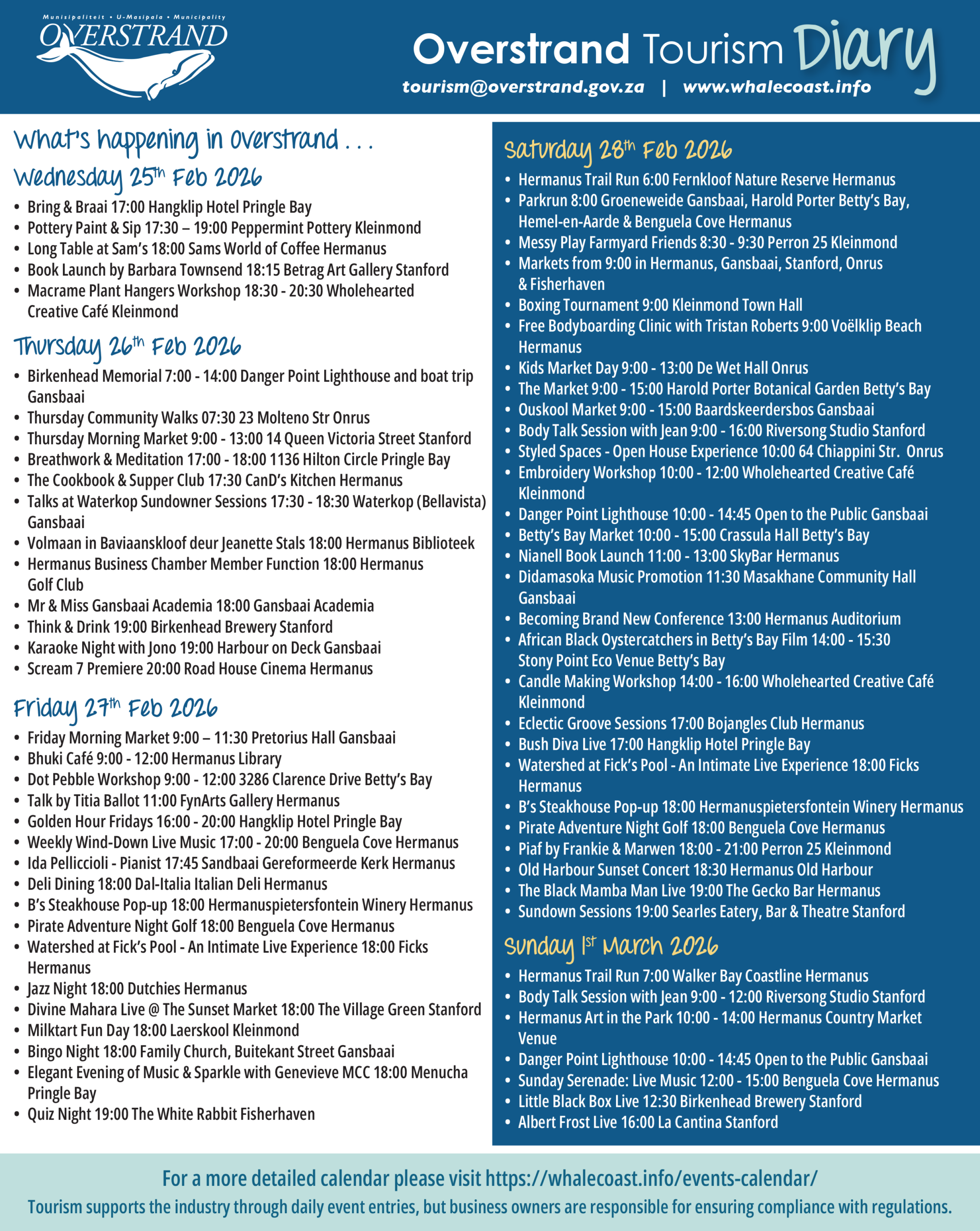 Overstrand Tourism Diary 25 Feb – 1 March 2026